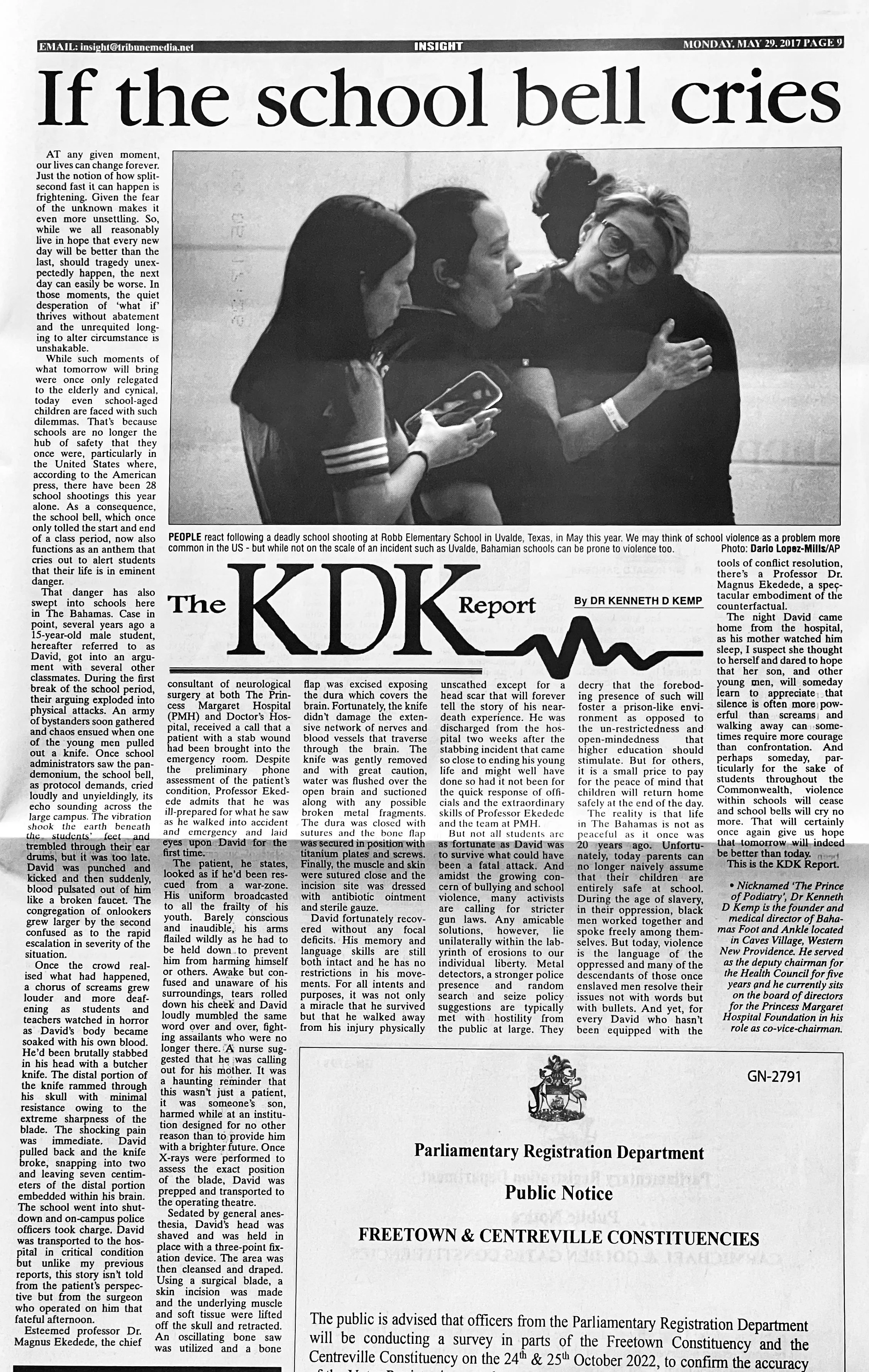 Esteemed professor Dr. Magnus Ekedede, the chief consultant of neurological surgery at both The Princess Margaret Hospital (PMH) and Doctor’s Hospital, received a call that a patient with a stab wound had been brought into the emergency room. Despite the preliminary phone assessment of the patient’s condition, Professor Ekedede admits that he was ill-prepared for what he saw as he walked into accident and emergency and laid eyes upon David for the first time.